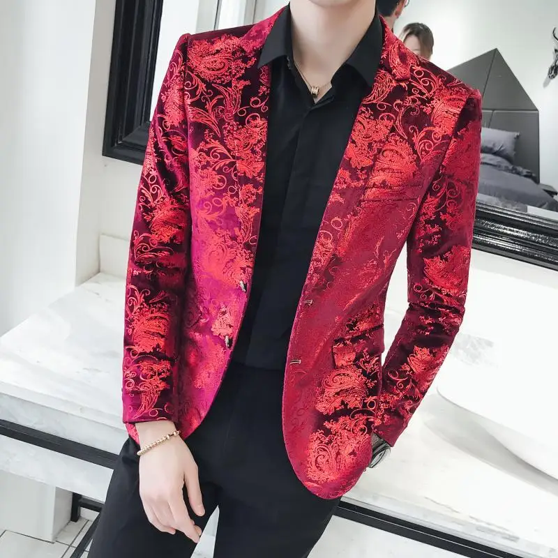 Fashion Blazer Men Spring 2019 Mens Red Floral Blazer Jacket Slim Fit Streetwear Men Blazer Night C