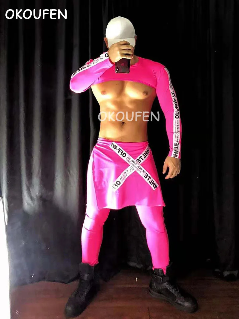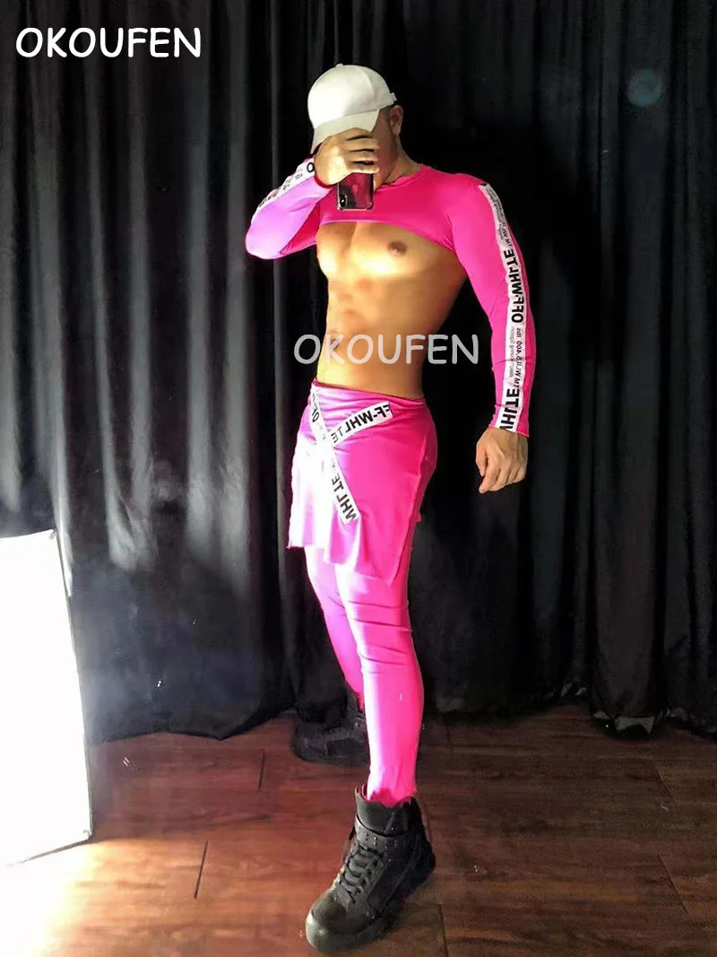 Sexy Night scene ds Fluorescent Pink Tooling costume Set New style Bar nightclub Male singer stage